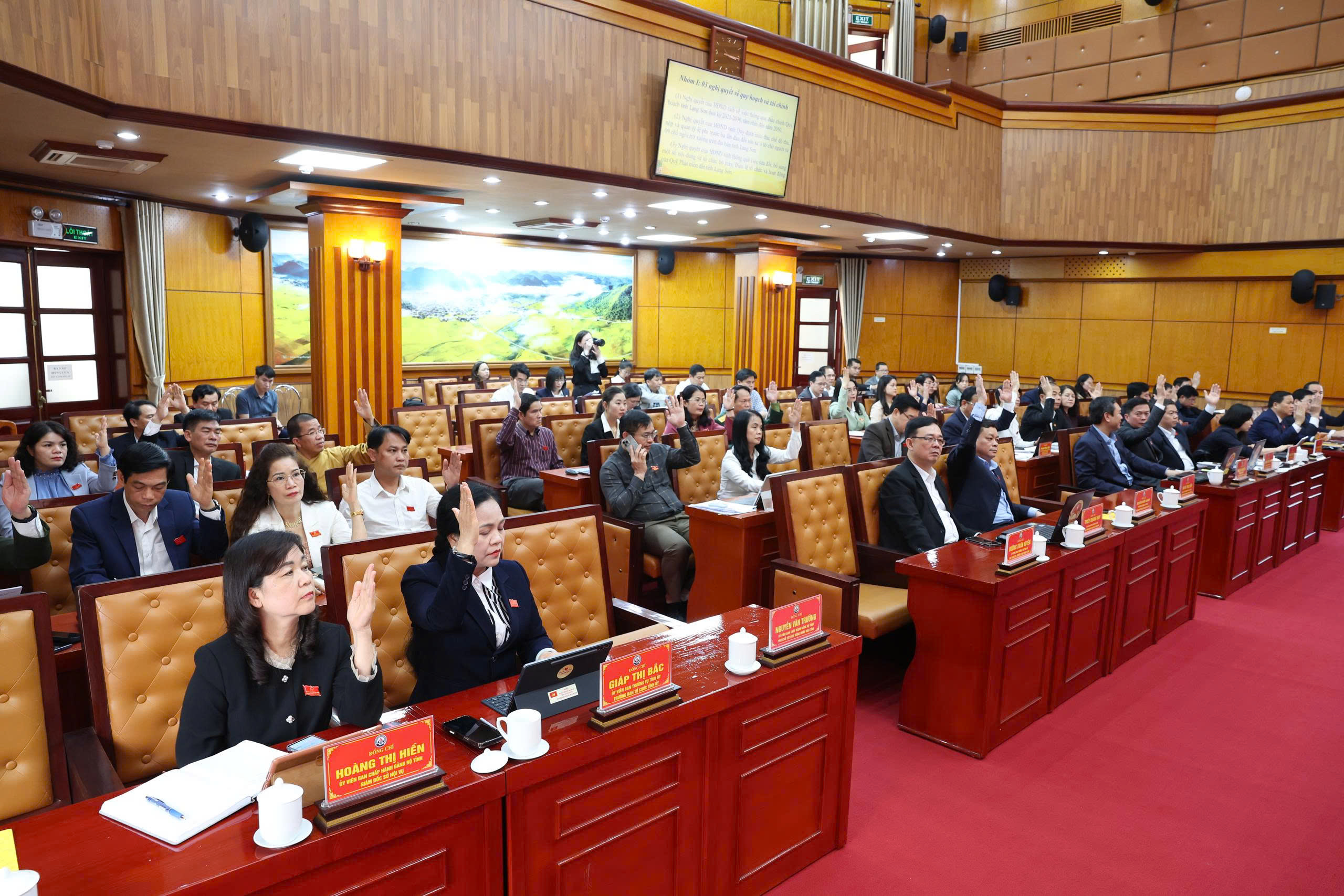 Trên cơ sở thảo luận, xem xét kỹ các dự thảo nghị quyết do UBND tỉnh trình. Với tinh thần “đoàn kết, thống nhất cao và hành động quyết liệt”, HĐND tỉnh đã biểu quyết thông qua 05 nghị quyết quan trọng, trong các lĩnh vực về quy hoạch và tài chính; sử dụng đất đai và chuyển mục đích sử dụng rừng. Đặc biệt, trong số các nghị quyết được HĐND tỉnh xem xét, thông qua có nghị quyết về điều chỉnh Quy hoạch tỉnh Lạng Sơn thời kỳ 2021-2030, tầm nhìn đến năm 2050. Nghị quyết đề ra mục tiêu xây dựng Lạng Sơn trở thành tỉnh biên giới có kinh tế phát triển, xã hội ổn định, quốc phòng, an ninh, môi trường sinh thái được bảo đảm, là một trong các cực tăng trưởng của vùng Trung du và miền núi phía Bắc vào năm 2030, trở thành tỉnh phát triển khá vào năm 2035; là trung tâm kết nối kinh tế, thương mại giữa Việt Nam, các nước ASEAN, Trung Quốc và châu Âu. Cơ cấu kinh tế của tỉnh chuyển dịch mạnh theo hướng các ngành công nghiệp, dịch vụ, du lịch trở thành động lực tăng trưởng chính, ngành nông nghiệp phát triển theo hướng sản xuất nông - lâm sản hàng hóa, dược liệu gắn với tổ chức không gian sản xuất tập trung, phát triển theo chuỗi giá trị, ứng dụng công nghệ, hiệu quả cao. Các lĩnh vực văn hóa, xã hội phát triển toàn diện, hệ thống kết cấu hạ tầng phát triển đồng bộ, hệ thống đô thị hiện đại, nguồn nhân lực chất lượng ngày càng cao và thực hiện chuyển đổi số hiệu quả trên cả bốn trụ cột: Chính phủ số, kinh tế số, xã hội số và cửa khẩu số...