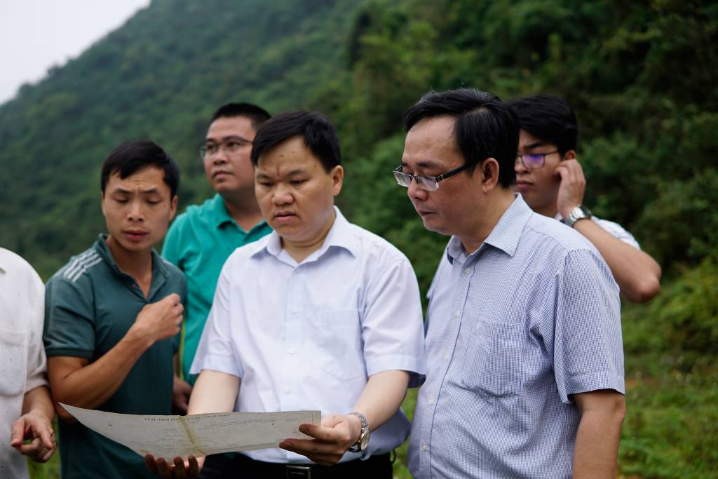 Đoàn khảo sát xem xét bản đồ khu vực khai thác mỏ quặng tại thôn Nà Ngườm, Nà Tồng, xã Tân Thanh, huyện Văn Lãng