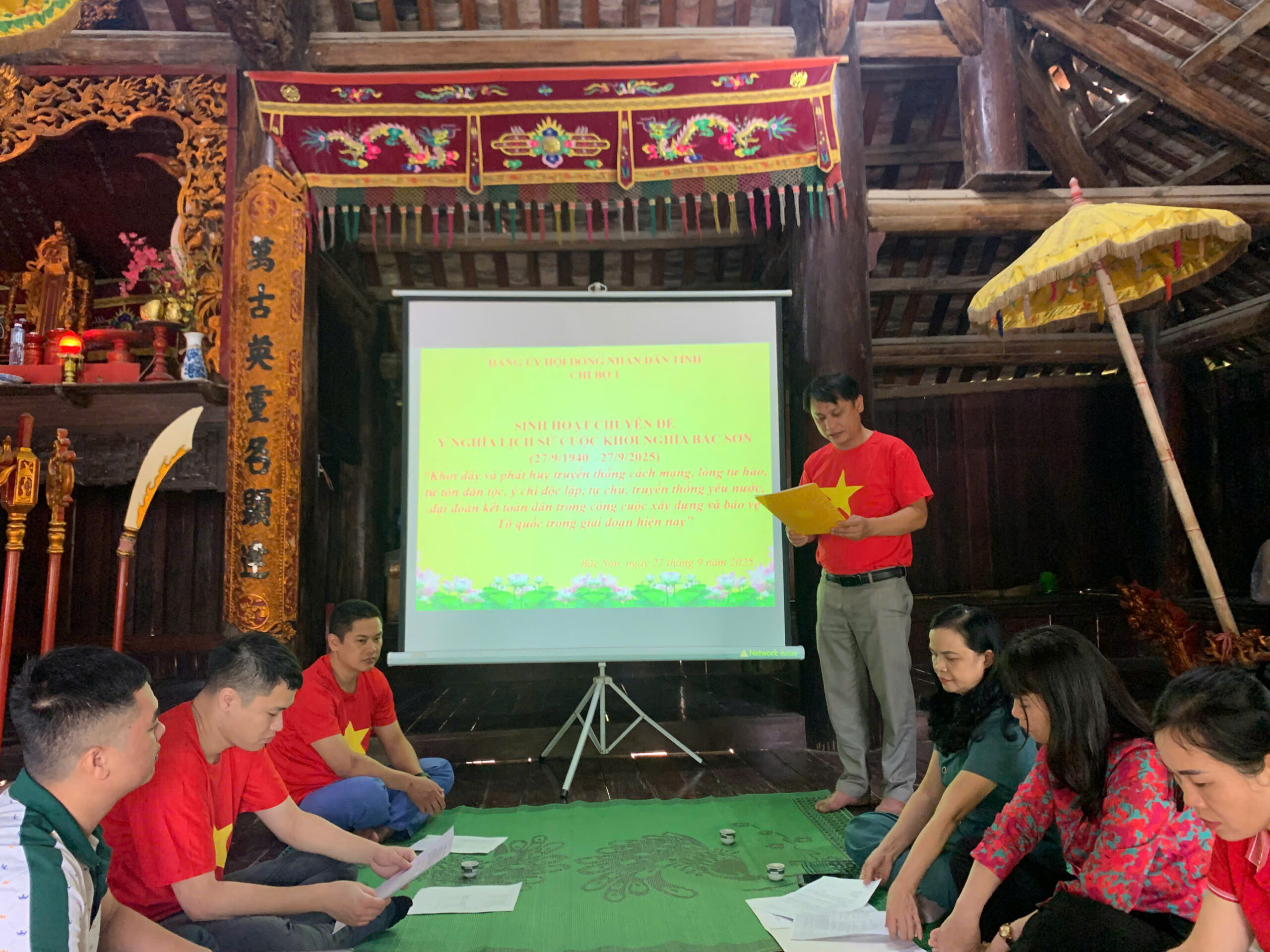 Sáng 27/9, Đoàn đến thăm Đình Nông Lục và Đồn Mỏ Nhài, Khu di tích Khuổi Nọi (xã Vũ Lễ) – nơi thành lập Đội Cứu quốc quân I, tiền thân của Quân đội nhân dân Việt Nam. Tại đây, các đảng viên được nghe thuyết trình về quá trình hình thành, diễn biến và ý nghĩa của cuộc khởi nghĩa. Những hình ảnh và câu chuyện lịch sử đã gợi nhắc tinh thần bất khuất, kiên cường của quân và dân Bắc Sơn, giáo dục đảng viên về trách nhiệm giữ gìn, phát huy truyền thống yêu nước, tinh thần cách mạng trong giai đoạn mới. Tại đây, Chi bộ đã tổ chức sinh hoạt chuyên đề với nội dung “Ý nghĩa lịch sử cuộc Khởi nghĩa Bắc Sơn (27/9/1940 – 27/9/2025); khơi dậy và phát huy truyền thống cách mạng, lòng tự hào, tự tôn dân tộc, ý chí độc lập, tự chủ, truyền thống yêu nước, đại đoàn kết toàn dân trong công cuộc xây dựng và bảo vệ Tổ quốc trong giai đoạn hiện nay” do đồng chí Lộc Minh Hiệp, Phó Trưởng Ban Dân tộc HĐND tỉnh trình bày. Buổi sinh hoạt đã giúp đảng viên hiểu sâu sắc hơn về ý nghĩa to lớn của Khởi nghĩa Bắc Sơn, từ đó bồi đắp lý tưởng cách mạng, củng cố niềm tin vào sự lãnh đạo của Đảng.