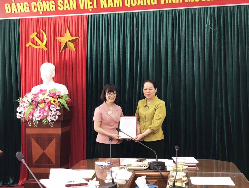 Đồng chí Hoàng Thúy Duyên, Bí thư Chi bộ trao Quyết định biểu dương và tặng thưởng cho đồng chí Nguyễn Minh Phượng (Ảnh Quốc Khánh)