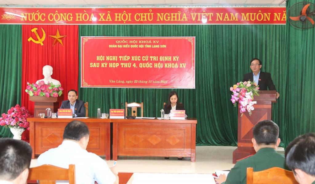 Thực hiện Kế hoạch số 202/KH- ĐĐBQH ngày 11/11/2022 của Đoàn đại biểu Quốc hội tỉnh; sáng ngày 22/11, Đoàn đại biểu Quốc hội tỉnh gồm các đại biểu: Triệu Quang Huy, Uỷ viên Ban Chấp hành Đảng bộ tỉnh, Uỷ viên Uỷ ban Tài chính, Ngân sách của Quốc hội, Phó Trưởng Đoàn chuyên trách Đoàn đại biểu Quốc hội tỉnh; Chu Thị Hồng Thái, đại biểu Quốc hội khoá XV, Uỷ viên Hội đồng Dân tộc của Quốc hội, Phó Chánh Văn phòng Hội Nông dân tỉnh; Lưu Bá Mạc, Ủy viên Ủy ban Khoa học, Công nghệ và Môi trường của Quốc hội, Trưởng phòng Quản lý công nghệ và đổi mới sáng tạo, Sở Khoa học và Công nghệ tỉnh đã thực hiện tiếp xúc cử tri định kỳ sau kỳ họp thứ 4, Quốc hội khóa XV tại cụm xã: Thanh Long – Thụy Hùng – Trùng Khánh, huyện Văn Lãng.