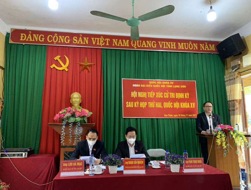 Thực hiện Kế hoạch số 164/KH-ĐĐBQH, ngày 02/11/2021 của Đoàn đại biểu Quốc hội tỉnh về việc tiếp xúc cử tri định kỳ sau kỳ họp thứ hai, Quốc hội khoá XV; ngày16, 17/11, Đoàn đại biểu Quốc hội tỉnh gồm các đại biểu: Hoàng Văn Nghiệm, Phó Bí thư Thường trực Tỉnh ủy, Ủy viên Ủy ban Kinh tế của Quốc hội, Trưởng Đoàn đại biểu Quốc hội khóa XV tỉnh; Phạm Trọng Nghĩa, Ủy viên chuyên trách Ủy ban Xã hội của Quốc hội; Lưu Bá Mạc, Ủy viên Ủy ban Khoa học, Công nghệ và Môi trường của Quốc hội, Trưởng phòng Quản lý công nghệ và đổi mới sáng tạo, Sở Khoa học và Công nghệ tỉnh đã thực hiện tiếp xúc cử tri định kỳ sau kỳ họp thứ hai, Quốc hội khóa XV tại các cụm xã: Hoa Thám, Quý Hòa, Hưng Đạo, Vĩnh Yên, huyện Bình Gia; Chiến Thắng, Vân An, Liên Sơn, huyện Chi Lăng.