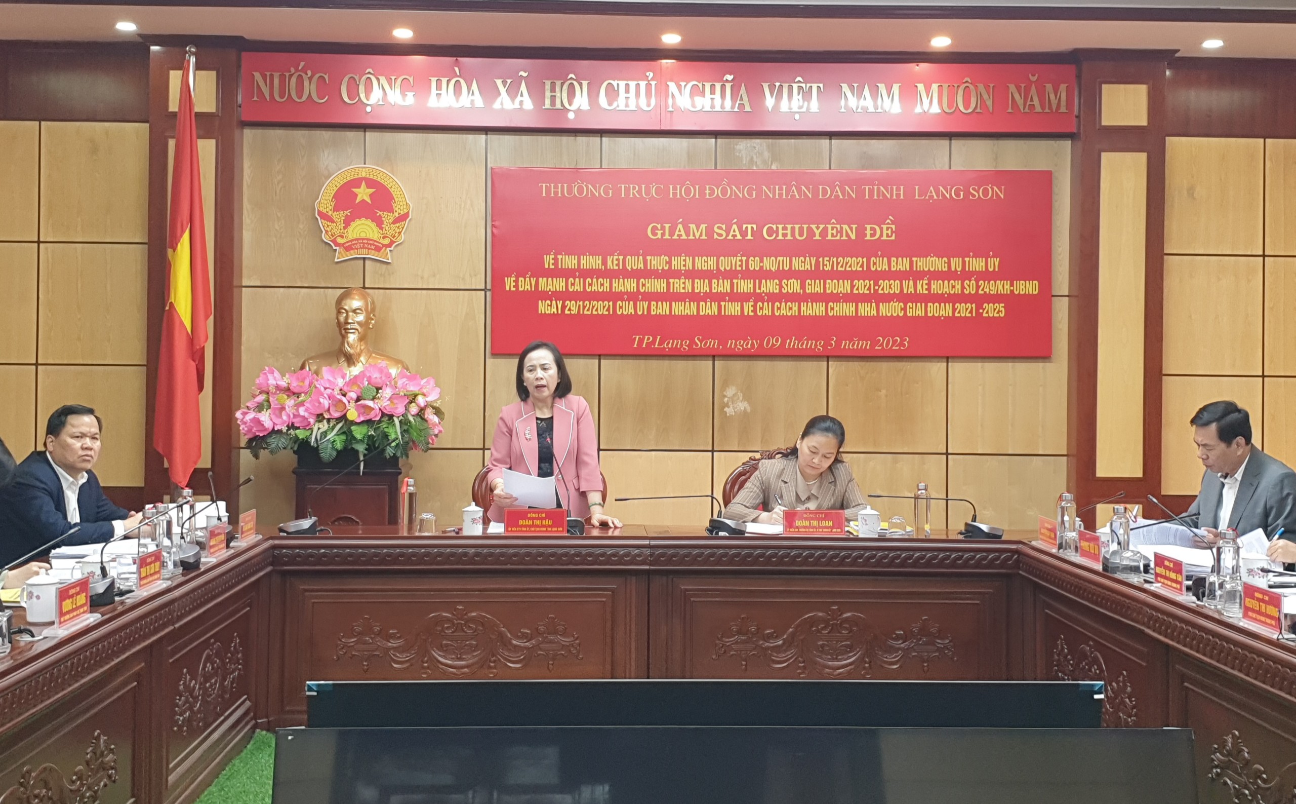 Sáng ngày 09/3/2023, Đoàn giám sát của Thường trực Hội đồng nhân dân (HĐND) tỉnh do đồng chí Đoàn Thị Hậu, Uỷ viên Ban Thường vụ Tỉnh uỷ, Chủ tịch HĐND tỉnh làm Trưởng đoàn; Đồng chí Đoàn Thị Loan, Uỷ viên Ban Thường vụ Tỉnh uỷ, Bí thư Thành ủy Lạng Sơn, Trưởng Ban Pháp chế HĐND tỉnh, Phó trưởng đoàn giám sát và các đồng chí lãnh đạo chuyên trách Ban Pháp chế HĐND tỉnh, các đồng chí đại diện lãnh đạo Ủy ban Mặt trận Tổ quốc Việt Nam tỉnh, Văn phòng UBND tỉnh, Sở Nội vụ thực hiện giám sát chuyên đề về tình hình, kết quả thực hiện Nghị quyết 60-NQ/TU ngày 15/12/2021 của Ban Thường vụ Tỉnh uỷ về đẩy mạnh cải cách hành chính (CCHC) trên địa bàn tỉnh Lạng Sơn, giai đoạn 2021-2030 và Kế hoạch số 249/KH-UBND ngày 29/12/2021 của Ủy ban nhân dân (UBND) tỉnh về CCHC Nhà nước giai đoạn 2021-2025 tại Ủy ban nhân dân thành phố Lạng Sơn.