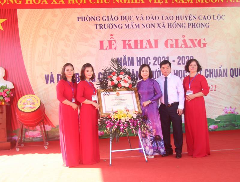 Trong khuôn khổ chương trình, đồng chí Đoàn Thị Hậu, Ủy viên Ban Thường vụ Tỉnh ủy, Chủ tịch HĐND tỉnh trao bằng công nhận trường đạt chuẩn quốc gia cho Trường Mần non xã Hồng Phong, huyện Cao Lộc