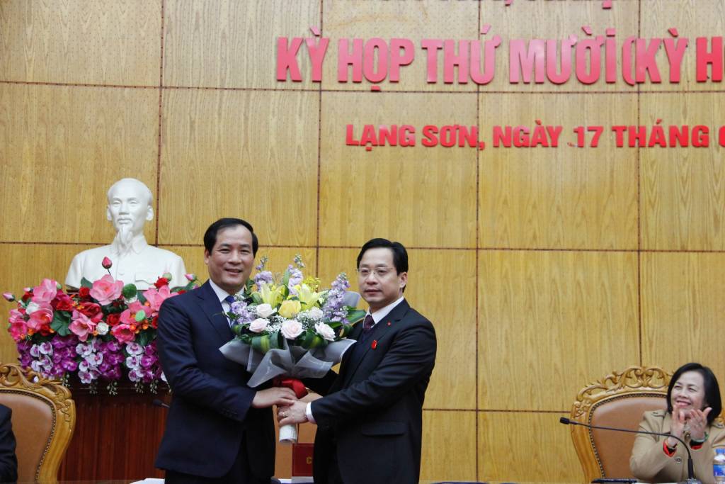 Đồng chí Hoàng Văn Nghiệm, Phó Bí thư Thường trực Tỉnh ủy, Chủ tịch HĐND tỉnh tặng hoa chúc mừng đồng chí Dương Xuân Huyên