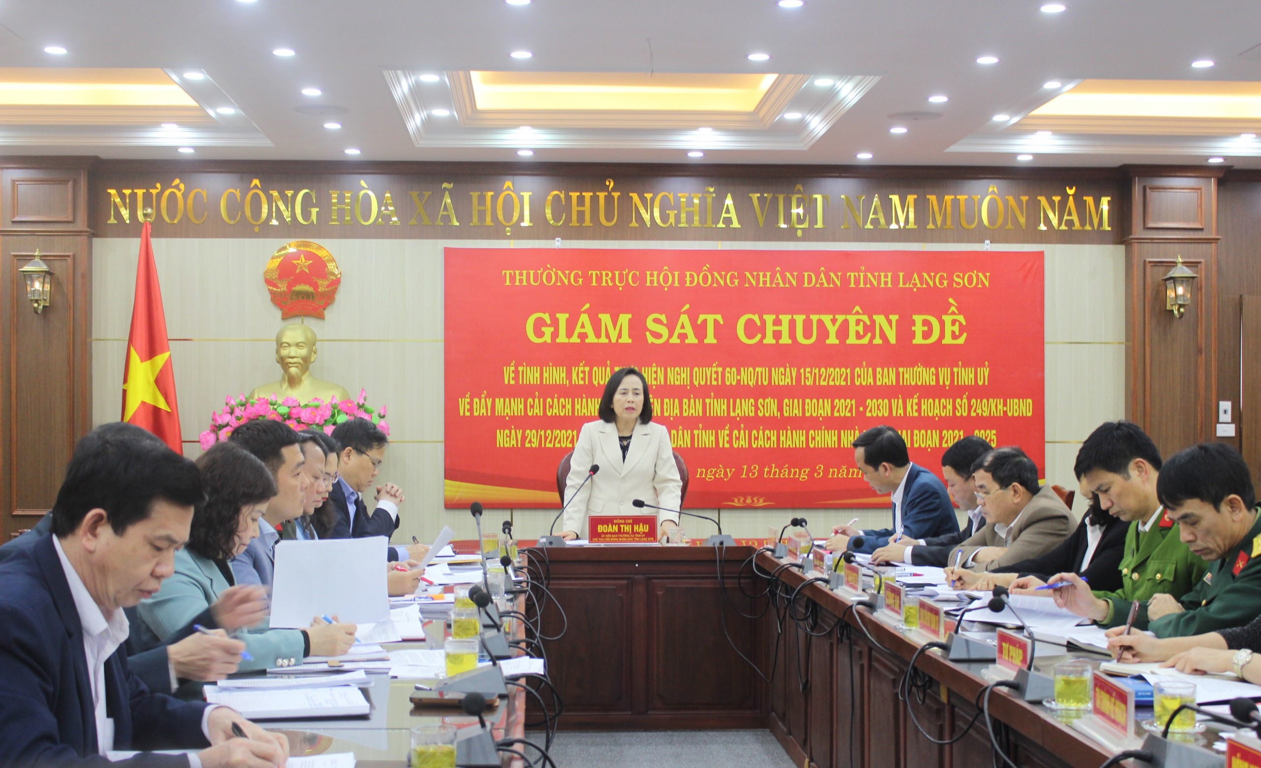 Chiều ngày 13/3/2023, Đoàn giám sát của Thường trực HĐND tỉnh do đồng chí Đoàn Thị Hậu, Uỷ viên Ban Thường vụ Tỉnh uỷ, Chủ tịch HĐND tỉnh làm Trưởng đoàn; các đồng chí lãnh đạo chuyên trách Ban Kinh tế, Ngân sách, Ban Pháp chế HĐND tỉnh, Ủy viên Ban Pháp chế HĐND tỉnh, Tổ trưởng tổ đại biểu HĐND tỉnh tại huyện Hữu Lũng; các đồng chí đại diện lãnh đạo Ủy ban Mặt trận Tổ quốc Việt Nam tỉnh, Văn phòng UBND tỉnh, Sở Nội vụ thực hiện giám sát chuyên đề về tình hình, kết quả thực hiện Nghị quyết 60-NQ/TU ngày 15/12/2021 của Ban Thường vụ Tỉnh uỷ về đẩy mạnh cải cách hành chính (CCHC) trên địa bàn tỉnh Lạng Sơn, giai đoạn 2021-2030 và Kế hoạch số 249/KH-UBND ngày 29/12/2021 của Ủy ban nhân dân (UBND) tỉnh về CCHC Nhà nước giai đoạn 2021-2025 tại Ủy ban nhân dân huyện Hữu Lũng.