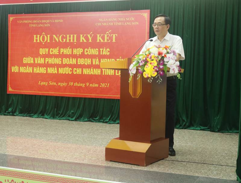 Sáng ngày 30/9/2021, Văn phòng Đoàn đại biểu Quốc hội và Hội đồng nhân dân tỉnh (Văn phòng Đoàn ĐBQH và HĐND tỉnh) và Ngân hàng Nhà nước Chi nhánh tỉnh Lạng Sơn (NHNN tỉnh) tổ chức Hội nghị tổng kết đánh giá kết quả sau 8 năm thực hiện Quy chế phối hợp, đề ra phương hướng nhiệm vụ và tiếp tục ký kết Quy chế phối hợp công tác. Dự Hội nghị có đồng chí Đoàn Thị Hậu, Ủy viên Ban Thường vụ Tỉnh ủy, Chủ tịch Hội đồng nhân dân tỉnh; đồng chí Triệu Quang Huy, Ủy viên Ban Chấp hành Đảng bộ tỉnh, Phó Trưởng Đoàn chuyên trách Đoàn đại biểu Quốc hội tỉnh.