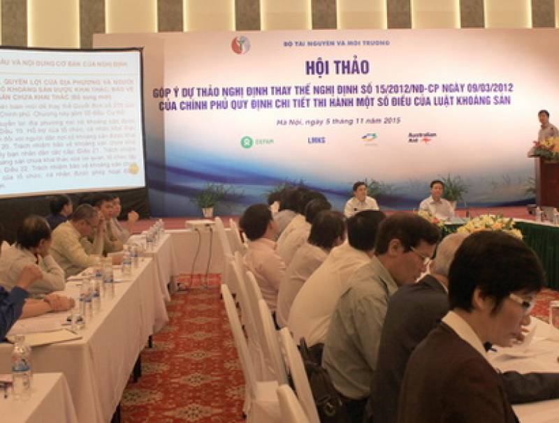 Ngày 5/11, Tổng cục Địa chất và Khoáng sản Việt Nam (Bộ TN&MT) đã tổ chức Hội thảo góp ý dự thảo Nghị định thay thế Nghị định số 15/2012/NĐ-CP ngày 9/3/2012 của Chính phủ quy định chi tiết thi hành một số điều của Luật khoáng sản 2010. Hơn 100 đại biểu đại diện cho các Bộ, ngành Trung ương, lãnh đạo các Sở TN&MT miền Bắc, khối doanh nghiệp và các hiệp hội đã đến dự để tham gia đóng góp ý kiến.